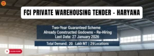 The Food Corporation of India (FCI), Haryana Region invites e-tenders for availing warehousing services under the Private Warehousing Scheme (PWS-2010). This tender offers a long-term opportunity for warehouse owners to lease scientifically constructed godowns with complete warehousing services at par with CWC/SWC standards.
