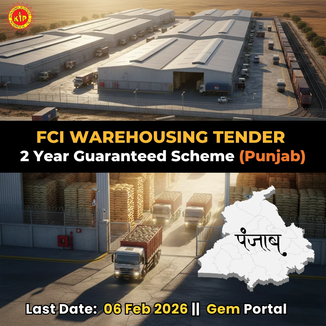 FCI Warehousing Tender – 2 Year Guaranteed Scheme (Punjab) The Food Corporation of India (FCI) has invited online tenders for hiring already constructed private warehouses (godowns) under its Private Warehousing Scheme (PWS) – 2 Year Guaranteed. This tender provides a low-risk, government-backed opportunity for warehouse owners and investors to lease their existing godowns to FCI and earn assured rental income for a fixed period. The scheme is designed to strengthen FCI’s foodgrain storage infrastructure while offering stable and predictable returns to private warehouse owners. Tender Summary Tendering Authority: Food Corporation of India (FCI)Scheme Name: Private Warehousing Scheme (PWS) – 2 Year GuaranteedContract Period: 2 Years (Extendable as per FCI discretion)Tender Platform: Government e-Marketplace (GeM)Bid Type: Two-Bid System (Technical + Financial)Godown Status: Already Constructed & ReadyLast Date of Submission: 06 February 2026 Locations & Capacity Covered Under this tender, FCI has notified 16 locations with a total storage requirement of approximately 14.19 Lakh Metric Tonnes (MT). The warehouses must be located at or near the notified centres and railheads as specified in the tender document.Distance from railhead or nearest FCI depot plays a role in price bid normalization. Type of Warehousing Allowed Lease with Services Warehouse owner provides: Storage space Watch & ward Preservation & quality control Insurance of stocks Maintenance & basic infrastructure GST Exempted for agricultural produce storage. Lease Only Warehouse owner provides: Storage space & infrastructure only GST applicable as per prevailing rates. Eligibility Criteria • Owners of already constructed warehouses• Individuals, Proprietorships, Firms, LLPs, Companies• Investors owning warehouse infrastructure• Warehouse owners seeking stable government income Key Benefits of This Tender ✔ Guaranteed rental income for 2 years✔ Association with a Government of India PSU✔ Low business risk compared to open market leasing✔ Timely payments as per government norms✔ No marketing or tenant-search cost✔ Long-term credibility for warehouse owners✔ Option for future extensions or repeat tenders Locations MANDATORY DOCUMENTS FOR TENDER 1. Proof of Ownership / Valid Lease Deed of Godown2. Latest Property Tax Receipt3. Approved Building Plan / Completion Certificate4. Structural Stability Certificate (from authorized engineer)5. Fire Safety Certificate / Fire NOC6. Warehouse Layout Plan & Capacity Certificate7. Photograph of Godown (inside & outside)8. Land Use Permission (Non-Agricultural / Industrial, if applicable)9. Identity & Address Proof of Applicant10. PAN Card11. GST Registration Certificate (if applicable)12. Bank Account Details & Cancelled Cheque13. Affidavit / Undertaking as per tender format Terms & Conditions 1 Any other work shall be separately Charged. 2 Any work related expenses such as Tender Fee/EMD/Digital Signature(if applicable)/Stamp Papers/Mohar/Layout Map/PAN/Partnership Deed/Lease Deed/Power of attorney/Notarization/CA. Certification etc. shall be born by party itself. 3 Party need to ensure Complete Documentation as required for Tender Filling. 4 We at KIP, Shall not be liable for not submission of tender due to Non- Submission of Documents/Not Making EMD Payment/Technical Problem on Portal or any other external cause/causes which are not controlable. 5 Party need to ensure Payment Mode for EMD Money and timely deposit of it. 6 Party need to fix up Financial bid at their end. 7 Party need to keep updated himself for Portal Update after submission of Tender. We at KIP, shall not be liable to give update for any further communication for said tender. 8 If Client want to take any services after submission of tender then that will be separatly charged. 9 Our Professional fees are not refundable. Contact KIP Team For Tender Filling 8683898080 | 9017951780 KIP Financial Consultancy Pvt. Ltd.